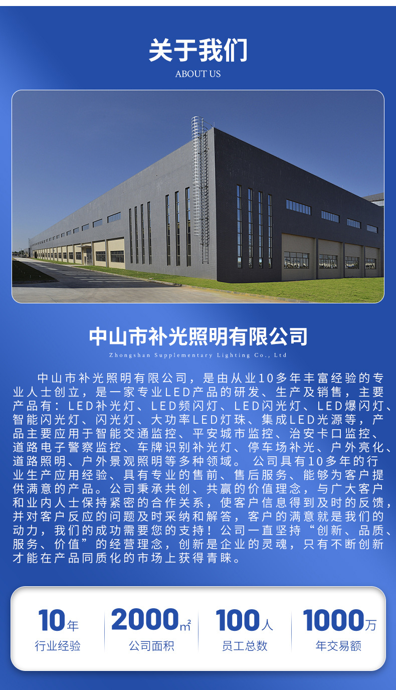 中山市補光照明有限公司是一家專業(yè)中山LED補光燈產(chǎn)品的研發(fā)、生產(chǎn)和銷售,主要產(chǎn)品有:中山LED補光燈、LED頻閃燈、LED閃光燈、LED爆閃燈等,產(chǎn)品主要應用于智能交通監(jiān)控戶外亮化、道路照明、戶外景觀照明等多種領(lǐng)域。